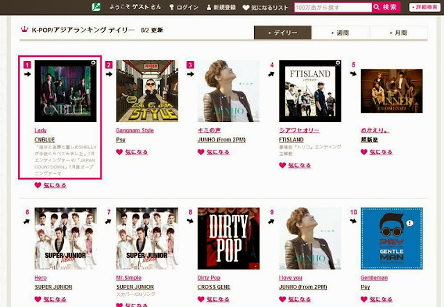 CNBLUE logró el lugar #1 con Lady en la clasificación diaria de KPOP / Asia, del ranking Recochoku, el día de hoy 3 de Agosto en Japón.